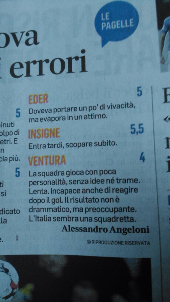 Un 5,5 in pagella per Lorenzo Insigne dalla redazione sportiva de Il Messaggero per il quarto d'ora giocato nel finale contro la Svezia ieri sera. L'errore del quotidiano romano non è tanto nel voto, discutibile, ma nel commento alla prestazione: "Entra tardi, scopare subito". Un chiaro errore di battitura, una m che manca e che provoca un clamoroso strafalcione che avrà fatto sorridere i più.