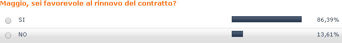 SONDAGGI A CONFRONTO - Abbiamo lanciato in data 24 novembre 2014 un sondaggio in cui si chiedeva agli utenti il gradimento nei confronti dell'idea del rinnovo contrattuale di Maggio che ha avuto voti molto equilibrati: su un campione di 329 votanti, il 51,37% si è detto favorevole al rinnovo, mentre il 48,63% no. Un dato di per se positivo, ma ancora più schiacciante se guardiamo il sondaggio proposto in data 10 febbraio 2015, a distanza di praticamente due mesi... due mesi in cui la notizia di un possibile rinnovo per il terzino azzurro non è più solo un dato statistico da giornale, ma una voce concreta: su un campione di 382 votanti, ben l'86,39% si è dichiarato favorevole, mentre solo il 13,61% è stato di parere opposto.