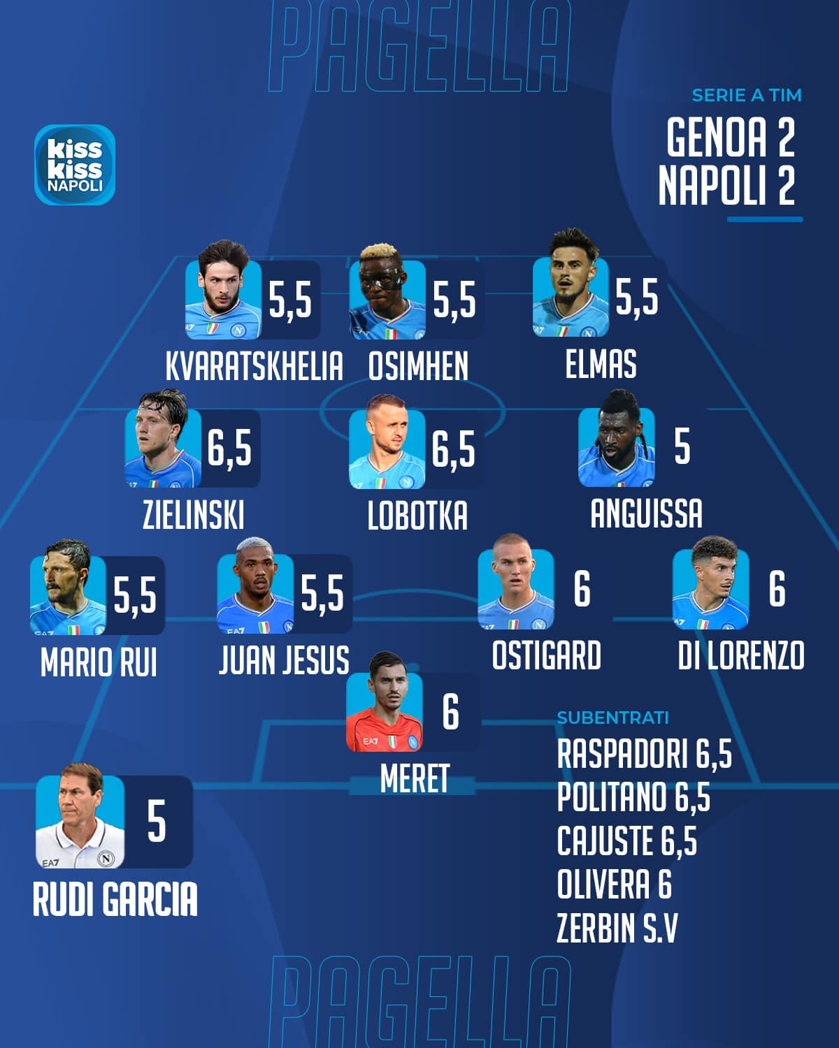 Il giornalista Paolo Del Genio ha assegnato i suoi voti ai calciatori del Napoli dopo il 2-2 contro il Genoa di Alberto Gilardino-