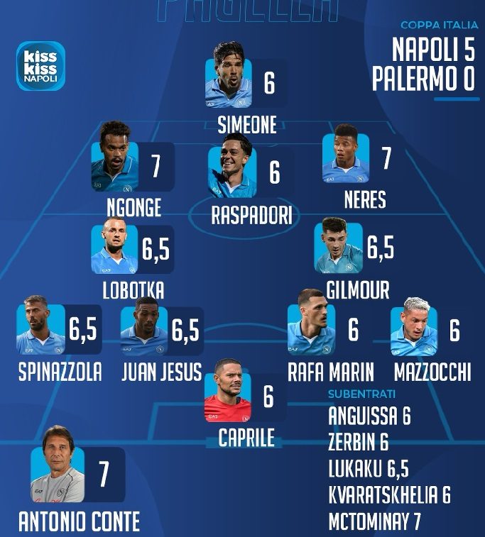Paolo Del Genio, giornalista, in virtù del risultato finale del Maradona, non ha voluto assegnare delle insufficienze. Ma il cronista, ai microfoni di Kiss Kiss, ha dato uno striminzito sei ai seguenti calciatori: Caprile, Marin, Mazzocchi, Raspadori e Simeone. I migliori in campo: Neres, Ngonge e Scott McTominay. Il calciatore scozzese ex Manchester United è entrato solo nella ripresa trovando subito la via della rete. In basso i voti del cronista partenopeo.