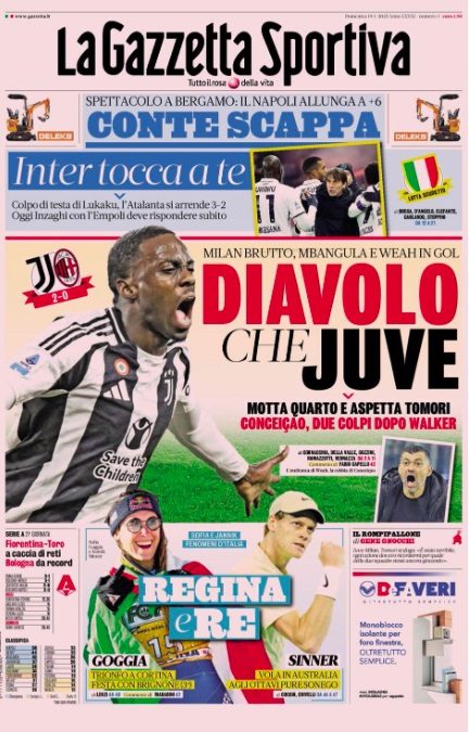 L'edizione odierna della Gazzetta dello Sport ha snobbato la vittoria del Napoli. Nella prima pagina del giornale milanese la notizia del successo dei partenopei è inserita in taglio alto occupando uno spazio minimo. La copertina è andata invece alla Juventus che in anticipo ha superato il Milan con il punteggio di 2-0. Eppure sia i bianconeri che i rossoneri sono decisamente attardati in classifica.