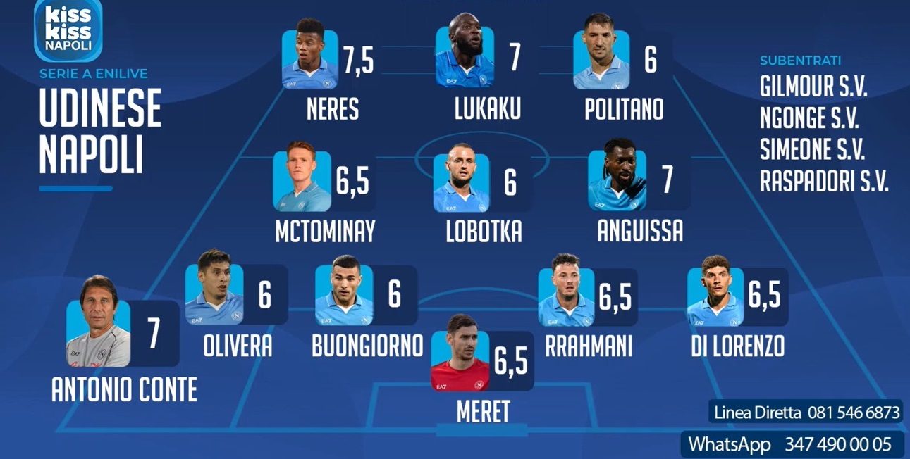 "Sette ad Anguissa che nel primo tempo non ha incantato, ma che è cresciuto in modo esponenziale nel corso della partita. Stesso voto a Lobotka. Meriterebbe di più, ma il calcio di rigore per l'Udinese nasce da una sua ingenuità. Sette a Lukaku. Prima del gol non stava entusiasmando, ma la rete del momentaneo 1-1 è importante e nasce da una grande azione del belga. 7.5 a Neres, il migliore in campo", ha aggiunto Paolo Del Genio.