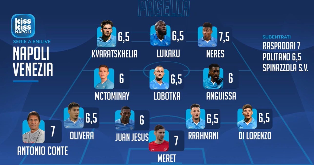 "Neres (7.5) può giocare a destra oppure a sinistra, ma è sempre forte, decisivo. Forse gli manca un po' di precisione in fase conclusiva altrimenti sarebbe stato da otto. So che mi criticherete, ma a Lukaku do un 6.5 in pagella. Non ha fatto bene nel primo tempo, ma da calciatore di carattere si è riscattato nella ripresa. Sottotono due pilastri del Napoli come Anguissa e McTominay, per entrambi sei", ha aggiunto Del Genio.