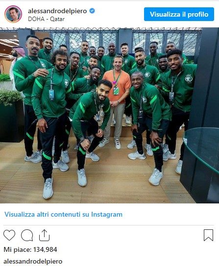 Sorpresa nella gara di oggi ai Mondiali 2022: l’Arabia Saudita ha battuto a sorpresa l’Argentina di Lionel Messi e dei calciatori della Juventus Leandro Paredes e Angel Di Maria. Attraverso i propri canali social, intanto, arrivano i complimenti di una delle leggende proprio della Vecchia Signora, ovvero Alessandro Del Piero, alla selezione saudita. L'ex attaccante della nazionale italiana ha postato una foto scattata proprio con la Nazionale araba, vera sorpresa del momento.