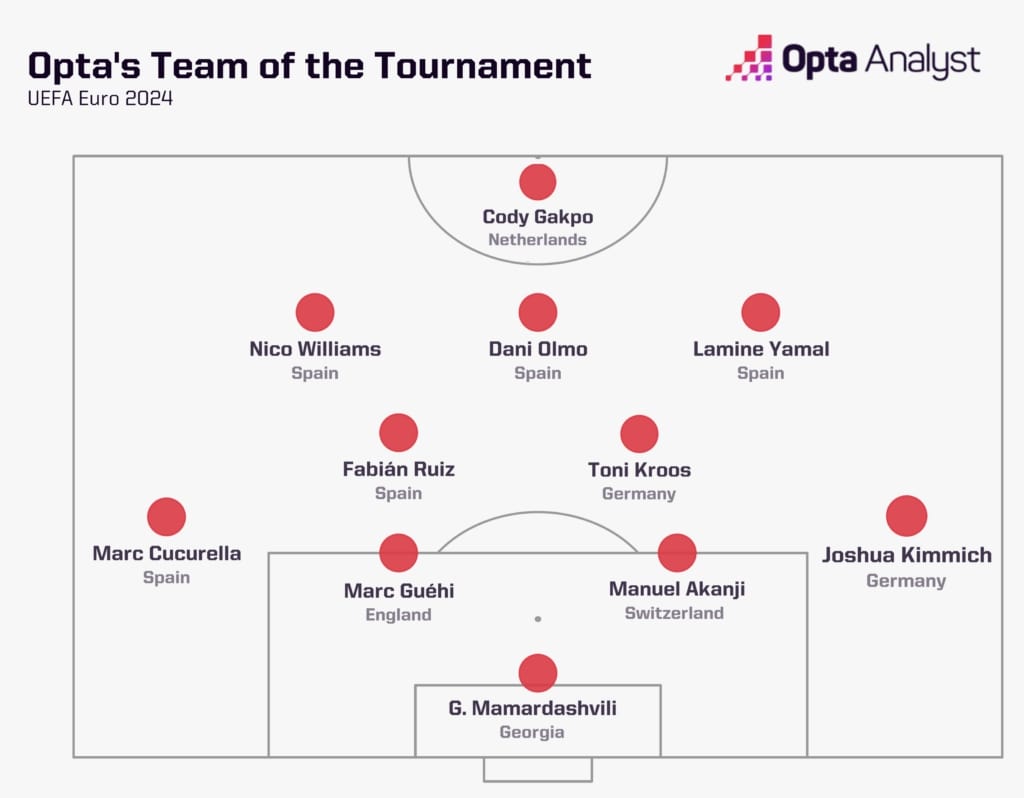 EURO 2024 si è concluso con la vittoria della Spagna, che ha dimostrato sul campo di meritare questo ambito titolo, grazie a prestazioni collettive di grande sacrificio e qualità. Ne sa qualcosa l'Italia, che proprio con gli iberici si è scontrata nel girone e n'è uscita malamente sconfitta. Diversi i calciatori della Nazionale di Luis de la Fuente che si sono messi in mostra e che, inevitabilmente, sono finiti nella "TOP 11" del Torneo stilata da Opta Analyst.