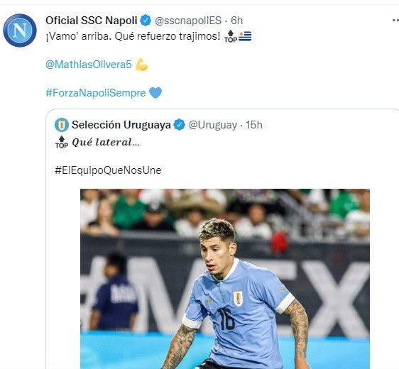 Mathias Olivera sta disputando ottime prestazioni con l'Uruguay e il Napoli lo coccola a distanza sui social parlando molto bene di lui su twitter.