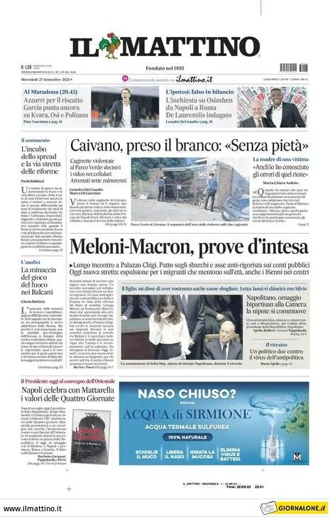 Sono tanti gli spunti che arrivano dalla prima pagina de Il Mattino. Il noto quotidiano si sofferma su alcuni degli argomenti più caldi del momento. Ecco alcuni titoli dell'ultima edizione: "L'inchiesta su Osimhen da Napoli a Roma, De Laurentiis indagato". E ancora: "Azzurri per il riscatto, Garcia punta ancora su Kvara, Osi e Politano", si legge nel trafiletto dedicato allo sport.