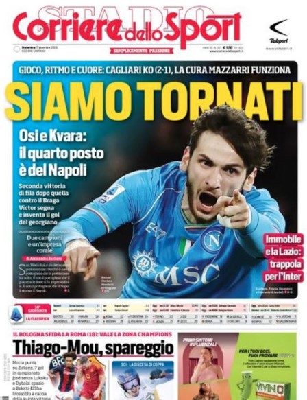 "Siamo tornati", titola così l'edizione campana del Corriere dello Sport di oggi 17 dicembre 2023, tra poche ore in edicola: parole chiare per raccontare la vittoria del Napoli per 2-1 sul Cagliari. "La cura Mazzarri funziona: gioco, ritmo e cuore. Seconda vittoria di fila dopo quella contro il Braga". In gol Osimhen e Kvara. Ora c'è il Frosinone in Coppa Italia e poi la Roma per continuare a scalare posizioni in classifica dopo gli ultimi mesi in cui i campioni d'Italia hanno lasciato troppi punti per strada.