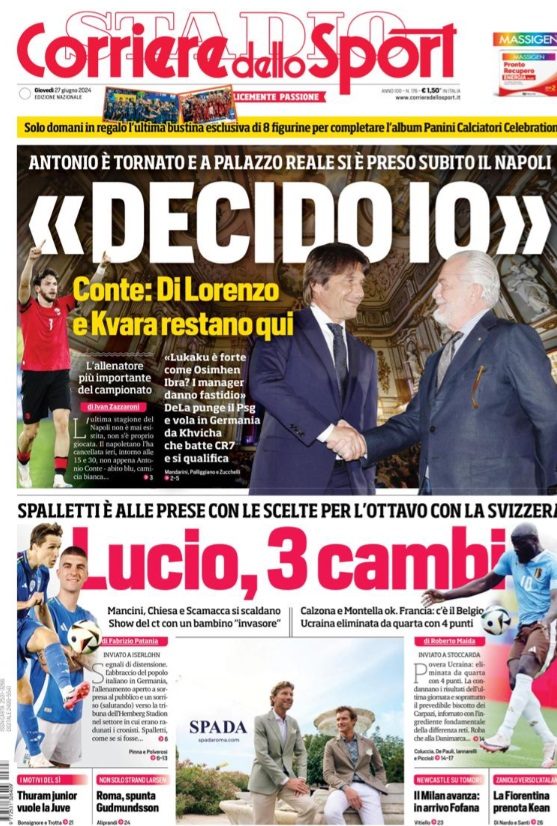L'edizione odierna del Corriere dello Sport, in prima pagina, dedica la copertina al Napoli. "'Decido io'. Antonio Conte è tornato e a Palazzo Reale su è preso dubito il Napoli".