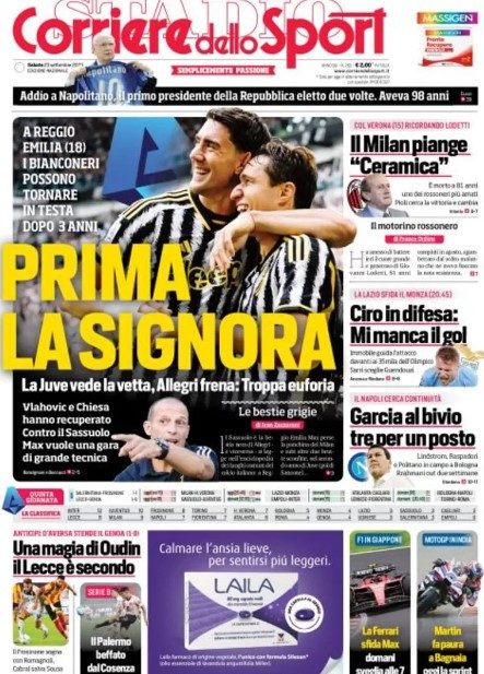 Sulla prima pagina del Corriere dello Sport, edizione del 23 settembre 2023 tra poche ore in edicola, apertura dedicata alla Juventus: "Prima la Signora": a Reggio Emilia i bianconeri possono tornare in vetta dopo tre anni e in attesa della sfida tra Empoli e Inter (nerazzurri a punteggio pieno). Allegri predica calma: "C'è troppa euforia". Spazio anche al Napoli di Rudi Garcia che è ad un bivio: a Bologna serve una vittoria. In tre per una maglia: Lindstrom, Raspadori e Politano. Intanto Rrahmani fuori due settimane.