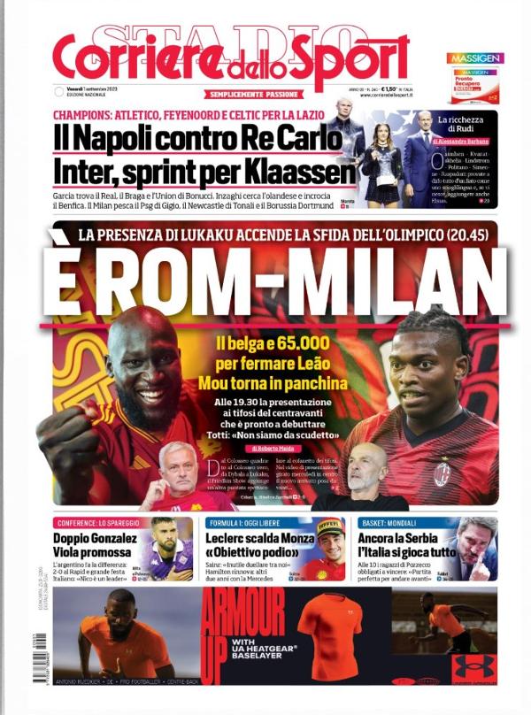 Sono tanti gli spunti che arrivano dalla prima pagina del Corriere dello Sport. Il noto quotidiano si sofferma su alcuni degli argomenti più caldi del momento. Ecco alcuni titoli dell'ultima edizione: "Il Napoli contro Re Carlo. Inter, sprint per Klaassen. Garcia trova il Real, il Braga e l'Union di Bonucci. Inzaghi cerca l'olandese e incrocia il Benfica".