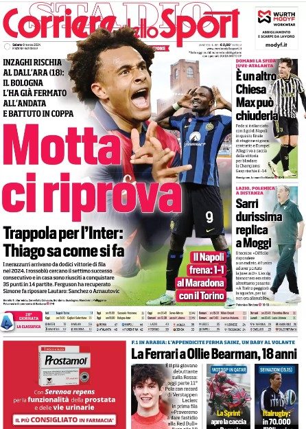 Sulla prima pagina del Corriere dello Sport, edizione del 9 marzo 2024, tra poche ore in edicola, apertura dedicata a Bologna-Inter: Thiago Motta, tecnico dei rossoblù, ci riprova, trappola per Simone Inzaghi e soci. Intanto il Napoli frena in casa: 1-1 col Torino. Maurizio Sarri, tecnico della Lazio, continua la sua polemica a distanza con Luciano Moggi: "Lui è radiato, è l'unico ad aver portato la Juventus in Serie B".