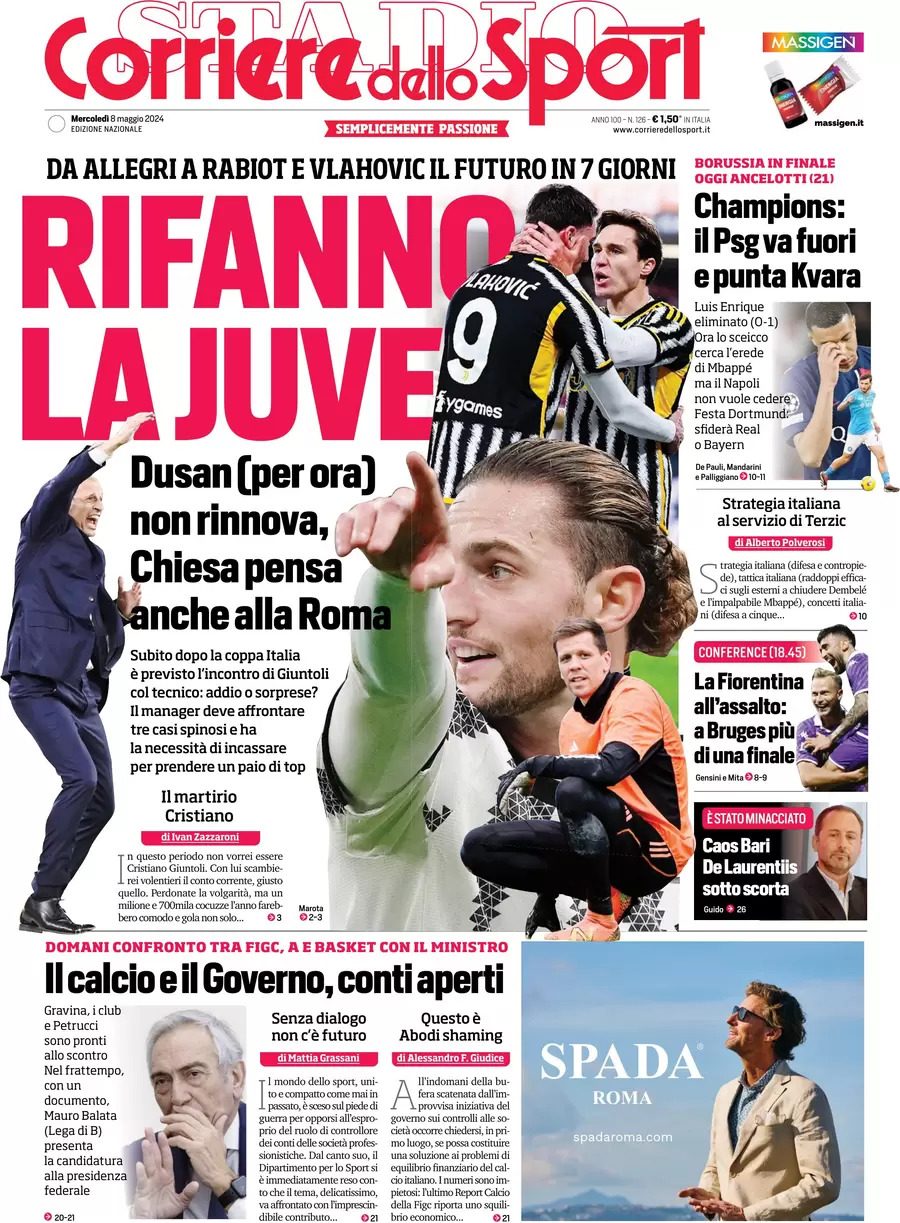 La prima pagina del noto quotidiano si sofferma sui temi più caldi del momento relativi al calcio italiano e non solo.
