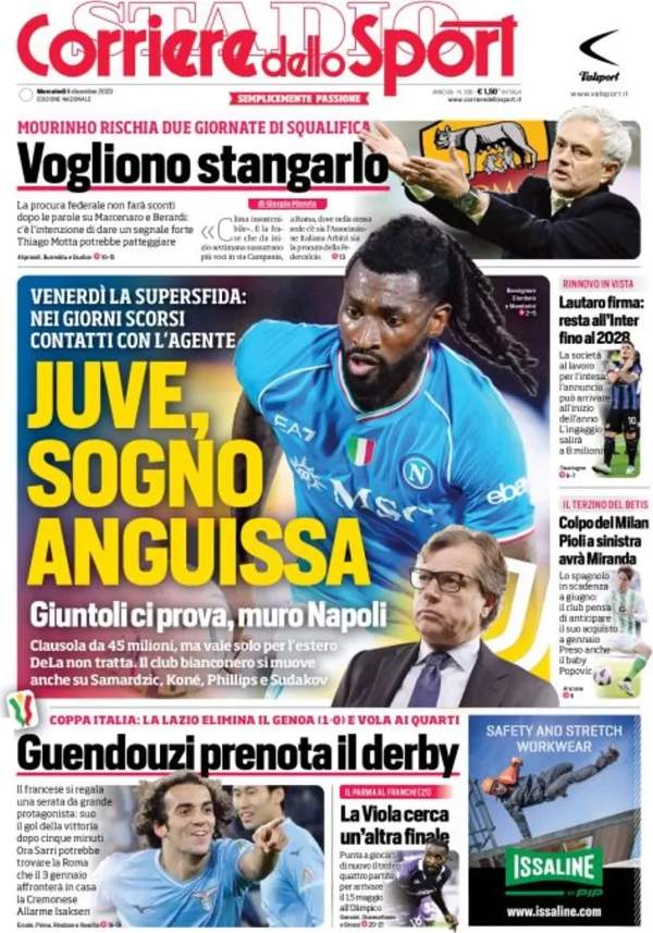 Sono tanti gli spunti che arrivano dalla prima pagina del Corriere dello Sport. Il noto quotidiano si sofferma su alcuni degli argomenti più caldi del momento. Ecco alcuni titoli dell'ultima edizione: "Juve, sogno Anguissa. Venerdì la super sfida, nei giorni scorsi contatti con l'agente: Gintoli ci prova, muro Napoli. Clausola da 45 milioni, ma vale solo per l'estero" si legge sul giornale.