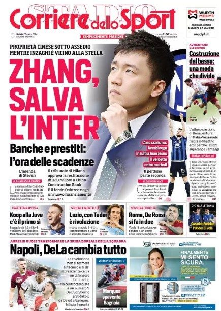 Il Corriere dello Sport, nell'edizione di oggi 23 marzo 2024, apre in prima pagina facendo il punto sul club partenopeo in vista del prossimo futuro: "Napoli, De La cambia tutto". E poi nel sommario si legge: "Aurelio vuole trasformare la spina dorsale della squadra". Da Buongiorno a Sudakov, da David a Gimenez. Poi spazio ai nerazzurri, futuri campioni d'Italia con alcuni problemi da risolvere: "Zhang, salva l'Inter". Il commento in alto: "Proprietà cinese sotto assedio mentre Inzaghi è vicino alla stella".