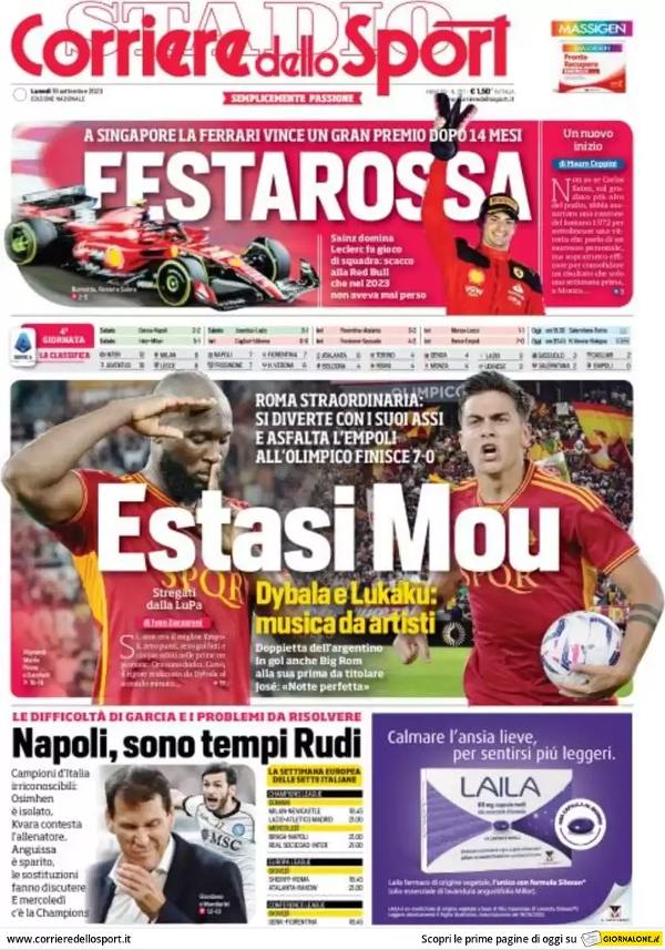 Sono tanti gli spunti che arrivano dalla prima pagina del Corriere dello Sport. Il noto quotidiano si sofferma su alcuni degli argomenti più caldi del momento. Ecco alcuni titoli dell'ultima edizione: "Napoli, sono tempi Rudi. Le difficoltà di Garcia e i problemi da risolvere. Campioni d'Italia irriconoscibili: Osimhen è isolato, Kvara contesta l'allenatore, Anguissa è sparito, le sostituzioni fanno discutere. E mercoledì c'è la Champions".