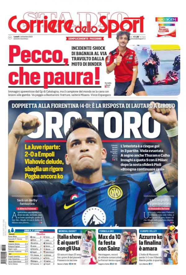Sono tanti gli spunti che arrivano dalla prima pagina del Corriere dello Sport. Il noto quotidiano si sofferma su alcuni degli argomenti più caldi del momento. Ecco alcuni titoli dell'ultima edizione: "Oro Toro. Doppietta alla Fiorentina: è la risposta di Lautaro a Giroud. L'interista è a cinque gol in tre partite".