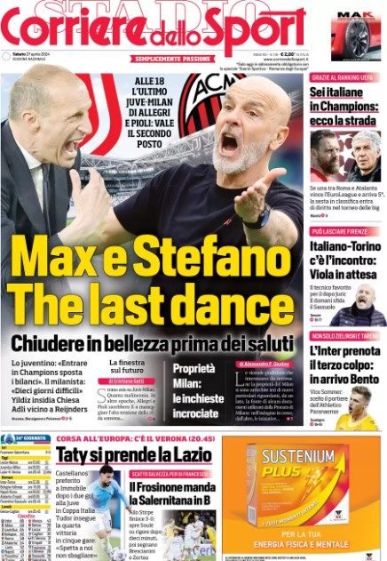 Sulla prima pagina del Corriere dello Sport, edizione del 27 aprile 2024, tra poche ore in edicola, spazio all'ultimo Juventus-Milan di Massimiliano Allegri e Stefano Pioli, i due tecnici che a fine stagione, quasi certamente, saluteranno i rispettivi club. La sfida vale il secondo posto alle spalle dell'Inter campione d'Italia. Intanto i nerazzurri hanno prenotato il terzo colpo: in arrivo Bento. Si parla inoltre della possibilità per l'Italia di portare sei squadre in Champions League: se una tra Roma e Atalanta vince l'Europa League e arriva 5° allora la sesta va in Champions.