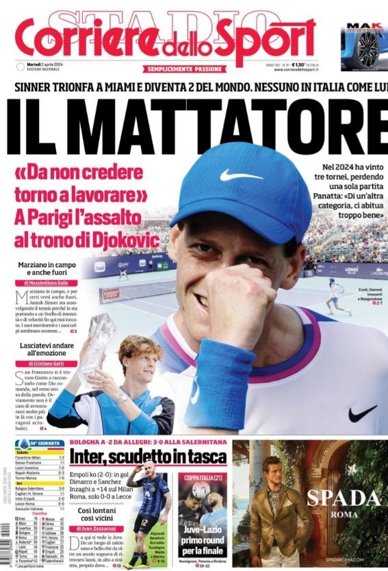 L'edizione odierna del Corriere dello Sport, in prima pagina, dedica la copertina a Sinner: "Il mattatore. Sinner trionfa a Miami e diventa numero due al mondo. Nessuno in Italia come lui".
