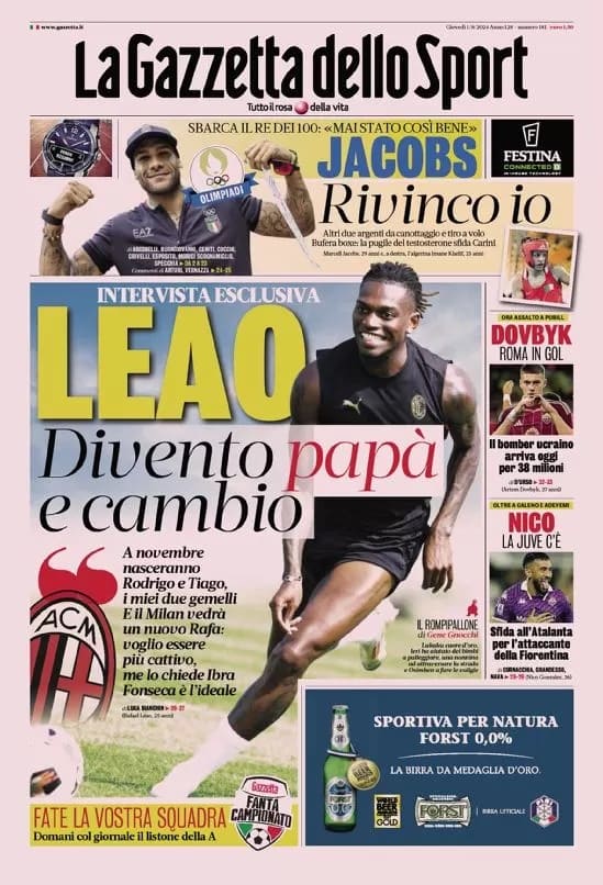 PRIMA PAGINA GAZZETTA - Jacobs: "Rivinco io". La Roma prende il bomber per 38 milioni
