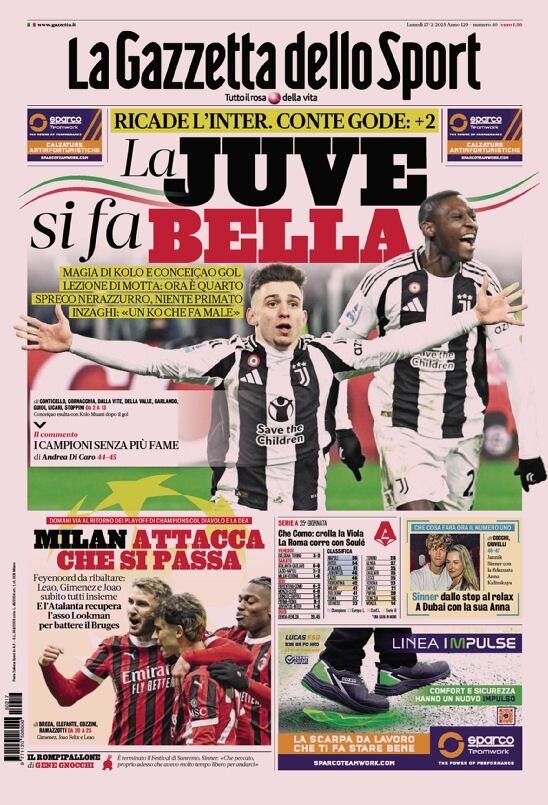 PRIMA PAGINA GAZZETTA - La Juve si fa bella. Ricade l'Inter, Conte gode: +2