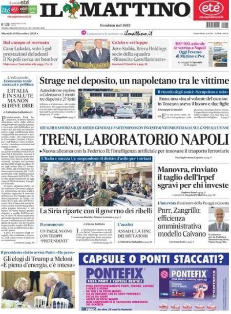 Il quotidiano Il Mattino, in prima pagina, dà spazio anche al Napoli con riferimento alle possibili mosse di mercato del club di Aurelio De Laurentiis.