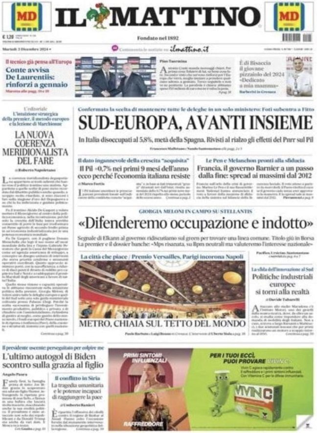 PRIMA PAGINA IL MATTINO - Conte avvisa De Laurentiis: rinforzi a gennaio