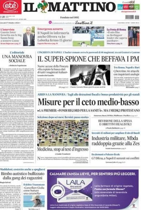 L'edizione odierna del quotidiano Il Mattino, in prima pagina, dà spazio anche al Napoli concentrandosi in particolare sulla emergenza infortuni che ha colpito la compagine allenata da mister Antonio Conte.