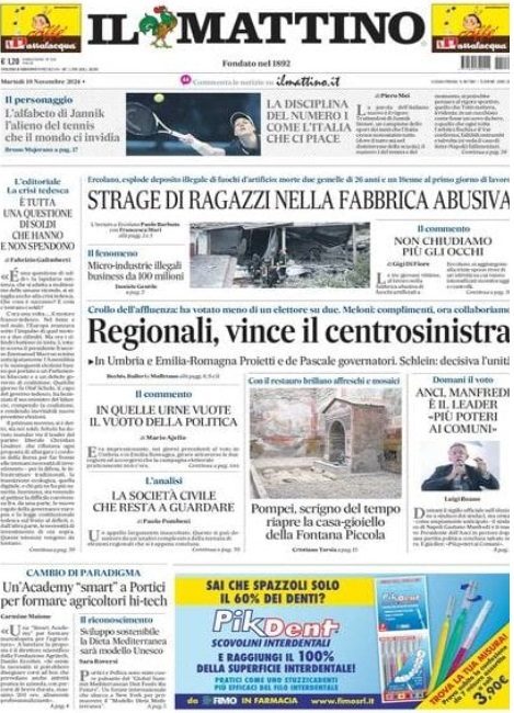 L'edizione odierna de Il Mattino, in prima pagina, dà spazio anche allo sport concentrandosi sull'ennesimo successo del tennista italiano Sinner.