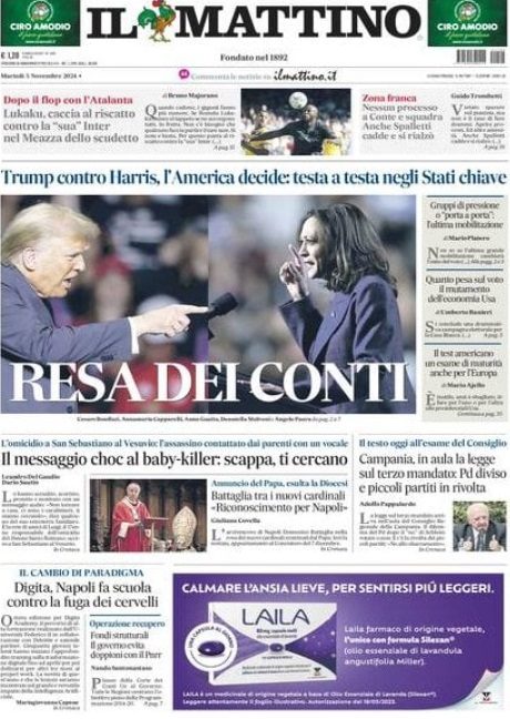 Il quotidiano Il Mattino, in prima pagina, dedica spazio anche al Napoli, sconfitto in casa per 0-3 dall'Atalanta.