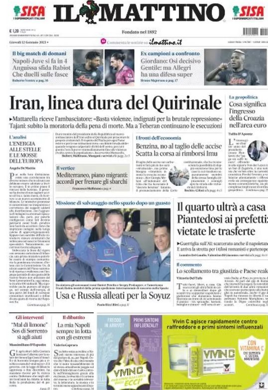 Il quotidiano Il Mattino, in prima pagina, si proietta alla sfida del Diego Armando Maradona tra il Napoli e la Juventus.