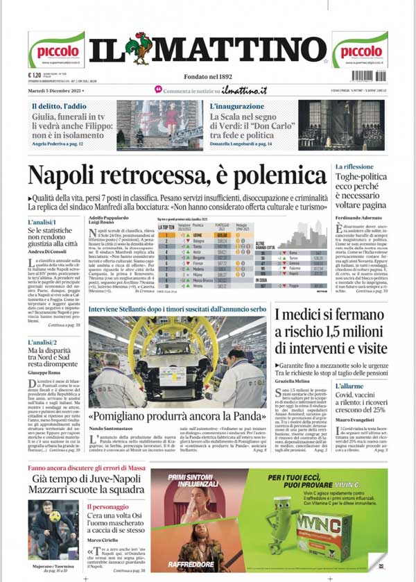 "Napoli retrocessa, è polemica", titola l'edizione odierna de Il Mattino in merito alla classifica della qualità della vita 2023. Spazio anche al calcio: "Già tempo di Juve-Napoli, Mazzarri scuote la squadra".