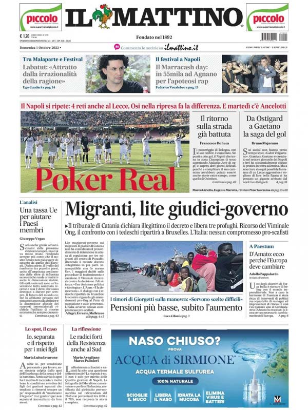 "Poker Real", titola in prima pagina l'edizione odierna de Il Mattino. Gli azzurri hanno battuto il Lecce 4-0 e si preparano a sfidare i Blancos dell'ex Carlo Ancelotti.