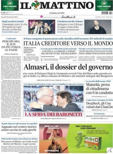 PRIMA PAGINA IL MATTINO - Roma-Napoli, la sfida dei baronetti. Intesa per Comuzzo