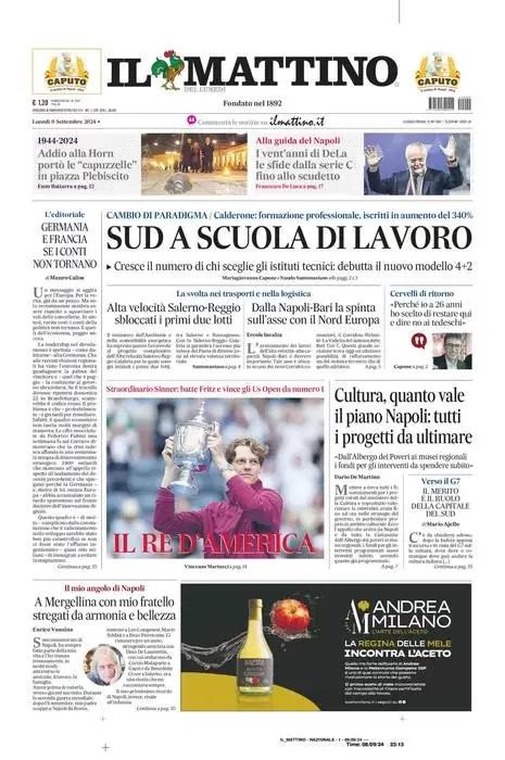 Sono tanti gli spunti che arrivano dalla prima pagina de Il Mattino. Il noto quotidiano si sofferma su alcuni degli argomenti più caldi del momento. Ecco alcuni titoli dell'ultima edizione: "I vent'anni di DeLa: le sfide dalla Serie C fino allo Scudetto". E ancora: "Il Re d'America. Straordinario Sinner: vince gli US Open da numero 1" si legge nello spazio dedicato allo sport.