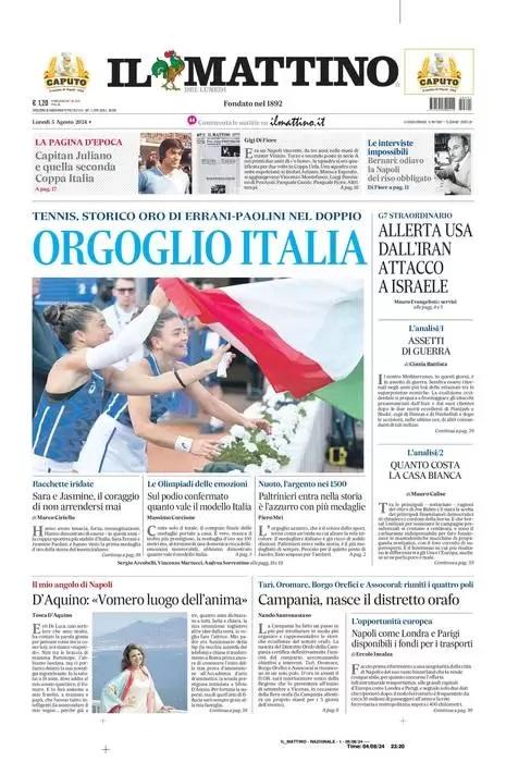 Sono tanti gli spunti che arrivano dalla prima pagina de Il Mattino. Il noto quotidiano si sofferma su alcuni degli argomenti più caldi del momento. Ecco alcuni titoli dell'ultima edizione: "Orgoglio Italia: tennis, storico oro". A proposito del Napoli: "Capitan Juliano e quella seconda Coppa Italia" si legge nello spazio dedicato allo sport.