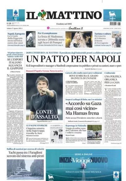 Sulla prima pagina del quotidiano Il Mattino, edizione del 17 agosto 2024, apertura dedicata al sì di imprenditori e manager al sindaco Gaetano Manfredi: "Un patto per Napoli", si legge. Si parla anche della prima partita di campionato per gli azzurri da quando c'è Antonio Conte in panchina: si va all'assalto dell'Hellas Verona (fischio di inizio alle ore 18,30 di domenica 18 agosto). Intanto sta per arrivare David Neres dal Benfica.