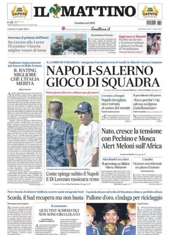 Sono tanti gli spunti che arrivano dalla prima pagina de Il Mattino. Il noto quotidiano si sofferma su alcuni degli argomenti più caldi del momento. Ecco alcuni titoli dell'ultima edizione: "Conte spinge subito il Napoli. E Di Lorenzo assicura: resto. Primo giorno di lavoro a Dimaro per gli azzurri" si legge nello spazio dedicato allo sport.