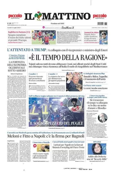 Sono tanti gli spunti che arrivano dalla prima pagina de Il Mattino. Il noto quotidiano si sofferma su alcuni degli argomenti più caldi del momento. Ecco alcuni titoli dell'ultima edizione: "Spagna campione, il team dei baby talenti si prende l'Europa". E ancora: "Napoli, DeLa vuole risolvere il caso Kvara: sì all'aumento" si legge nello spazio dedicato allo sport.