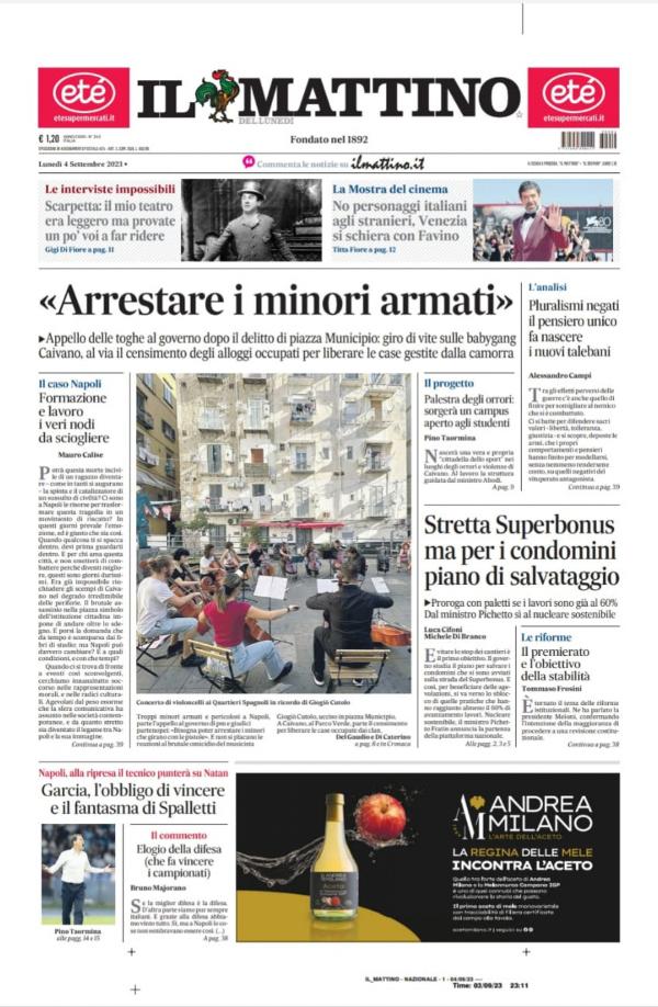 Sono tanti gli spunti che arrivano dalla prima pagina de Il Mattino. Il noto quotidiano si sofferma su alcuni degli argomenti più caldi del momento. Ecco alcuni titoli dell'ultima edizione: "Garcia, l'obbligo di vincere e il fantasma di Spalletti. Napoli, alla ripresa il tecnico punterà su Natan", si legge nel trafiletto dedicato allo sport.