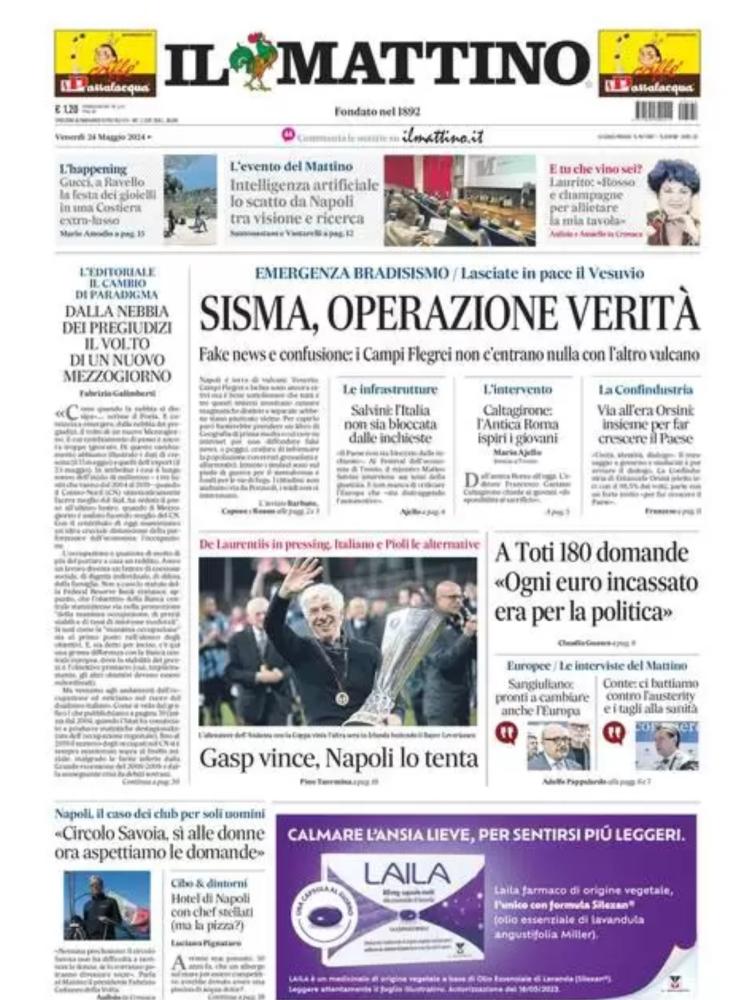 Sono tanti gli spunti che arrivano dalla prima pagina de Il Mattino. Il noto quotidiano si sofferma su alcuni degli argomenti più caldi del momento. Ecco alcuni titoli dell'ultima edizione: "Gasp vince, Napoli lo tenta. De Laurentiis in pressing, Italiano e Pioli le alternative" si legge nello spazio dedicato allo sport.