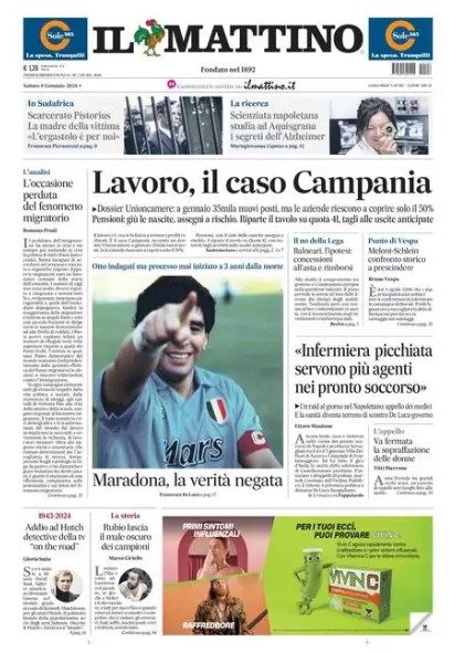 Nell'edizione di oggi 6 gennaio 2024, tra poche ore in edicola, Il Mattino dedica spazio in prima pagina al caso relativo a Diego Armando Maradona, con le indagini sulla morte che sono ancora in corso. Ecco quanto si legge: "Maradona, la verità negata. Otto indagini ma processo mai iniziato a tre anni dalla morte".