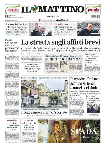 Sulla prima pagina del quotidiano Il Mattino, nel taglio alto fa il punto sul Napoli attraverso le parole di Francesco Calzona che ha rilasciato alcune dichiarazioni in conferenza stampa in vista della sfida di campionato contro la Roma. Il tecnico dei partenopei non ci sta e chiede ai calciatori azzurri una reazione d'orgoglio contro i giallorossi. Spazio anche alle ore di ansia che si vivono in Inghilterra per le condizioni di salute di Re Carlo.