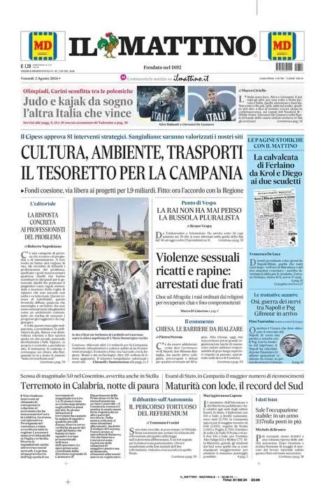 Sono tanti gli spunti che arrivano dalla prima pagina de Il Mattino. Il noto quotidiano si sofferma su alcuni degli argomenti più caldi del momento. Ecco alcuni titoli dell'ultima edizione: "La cavalcata di Ferlaino, da Krol e Diego ai due scudetti". E ancora: "Osi, guerra di nervi tra Napoli e PSG. Gilmour in arrivo" si legge nello spazio dedicato allo sport.