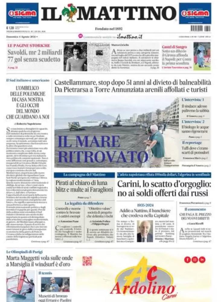Sono tanti gli spunti che arrivano dalla prima pagina de Il Mattino. Il noto quotidiano si sofferma su alcuni degli argomenti più caldi del momento. Ecco alcuni titoli dell'ultima edizione: "Castel di Sangro: sotto un diluvio, il Girona affonda il Napoli: per Conte la prima sconfitta" si legge nello spazio dedicato allo sport.