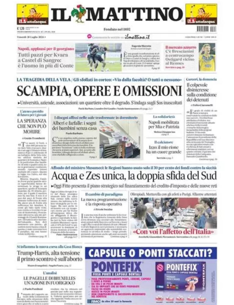 Sono tanti gli spunti che arrivano dalla prima pagina de Il Mattino. Il noto quotidiano si sofferma su alcuni degli argomenti più caldi del momento. Ecco alcuni titoli dell'ultima edizione: "Tutti pazzi per Kvara a Castel di Sangro: è l'uomo in più di Conte". Sul mercato, invece: "C'è Brescianini a centrocampo. Ostigard vicino al Rennes" si legge nello spazio dedicato allo sport.