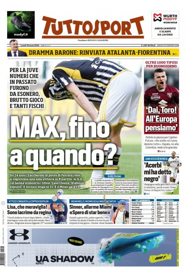 Sono tanti gli spunti che arrivano dalla prima pagina di Tuttosport. Il noto quotidiano si sofferma su alcuni degli argomenti più caldi del momento. Ecco alcuni titoli dell'ultima edizione: "Acerbi mi ha detto negro. Juan Jesus denuncia. Vergogna nella giornata contro il razzismo" si legge sul giornale.
