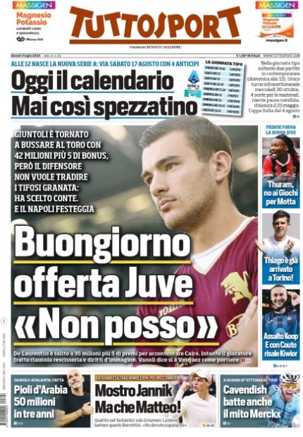 "Buongiorno, offerta Juve: 'Non posso'. Giuntoli è tornato a bussare al Toro con 42 milioni più 5 di bonus, però il difensore non vuole tradire i tifosi granata: ha scelto Conte e il Napoli festeggia", si legge sul quotidiano.