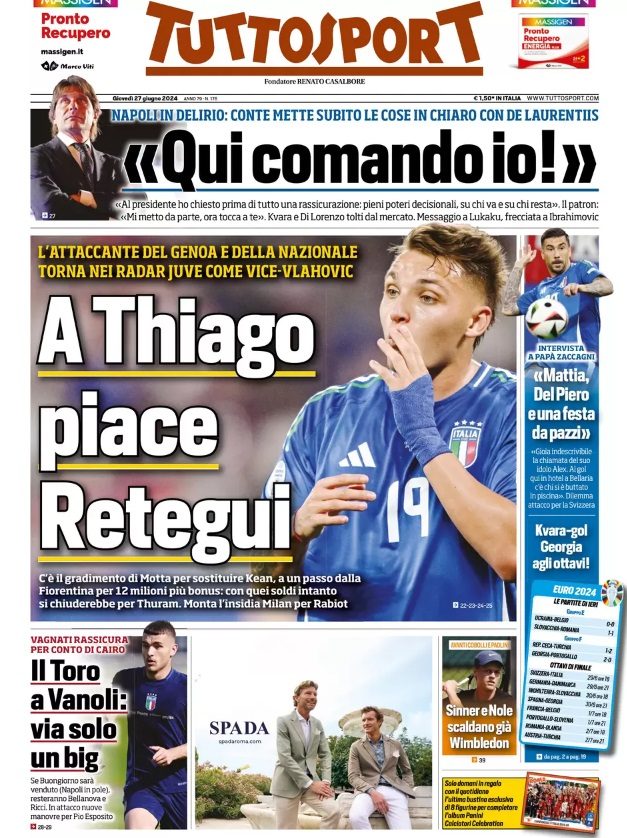 L'edizione odierna del quotidiano TuttoSport, in prima pagina, dedica la copertina al mercato in entrata della Juventus: "A Thiago piace Retegui. C'è il gradimento di Motta per sostituire Kean".