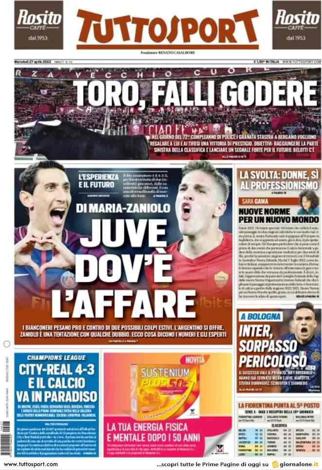 PRIMA PAGINA TUTTOSPORT - Di Maria si offre alla Juve. Zaniolo, tentazione con dubbio